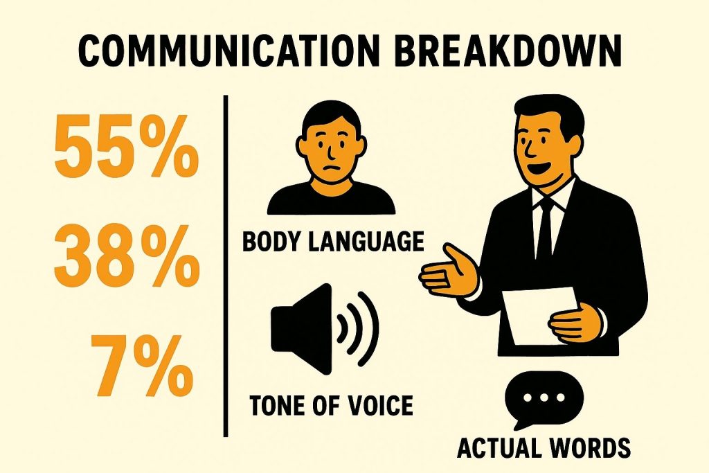 Research by Albert Mehrabian reveals that only 7% of communication is verbal. The remaining 93% comes from your tone (38%) and body language (55%). This means your presence is communicating volumes before you even speak.